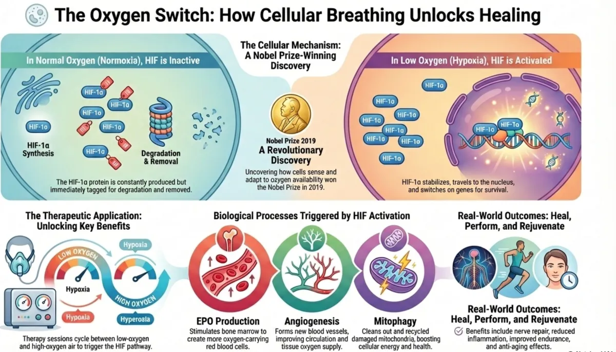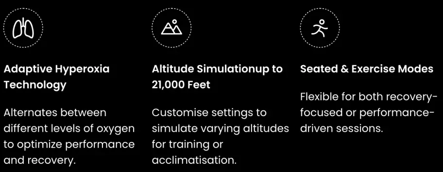 What happens: Oxygen gently shifts between low (11–15%) and high (60–75%) levels to activate your body’s natural response systems.